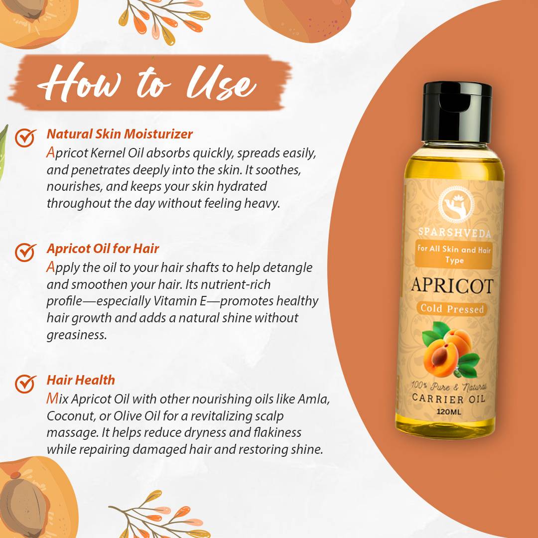 For hair and scalp, Sparshveda Apricot Oil provides light yet effective nourishment that reduces dryness, itchiness and dandruff, while coating the hair shaft to improve softness, shine and manageability.