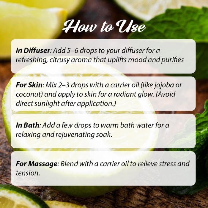 Always follow standard essential-oil safety: dilute before skin use, avoid contact with eyes and mucous membranes, and do not apply to skin before sun exposure.