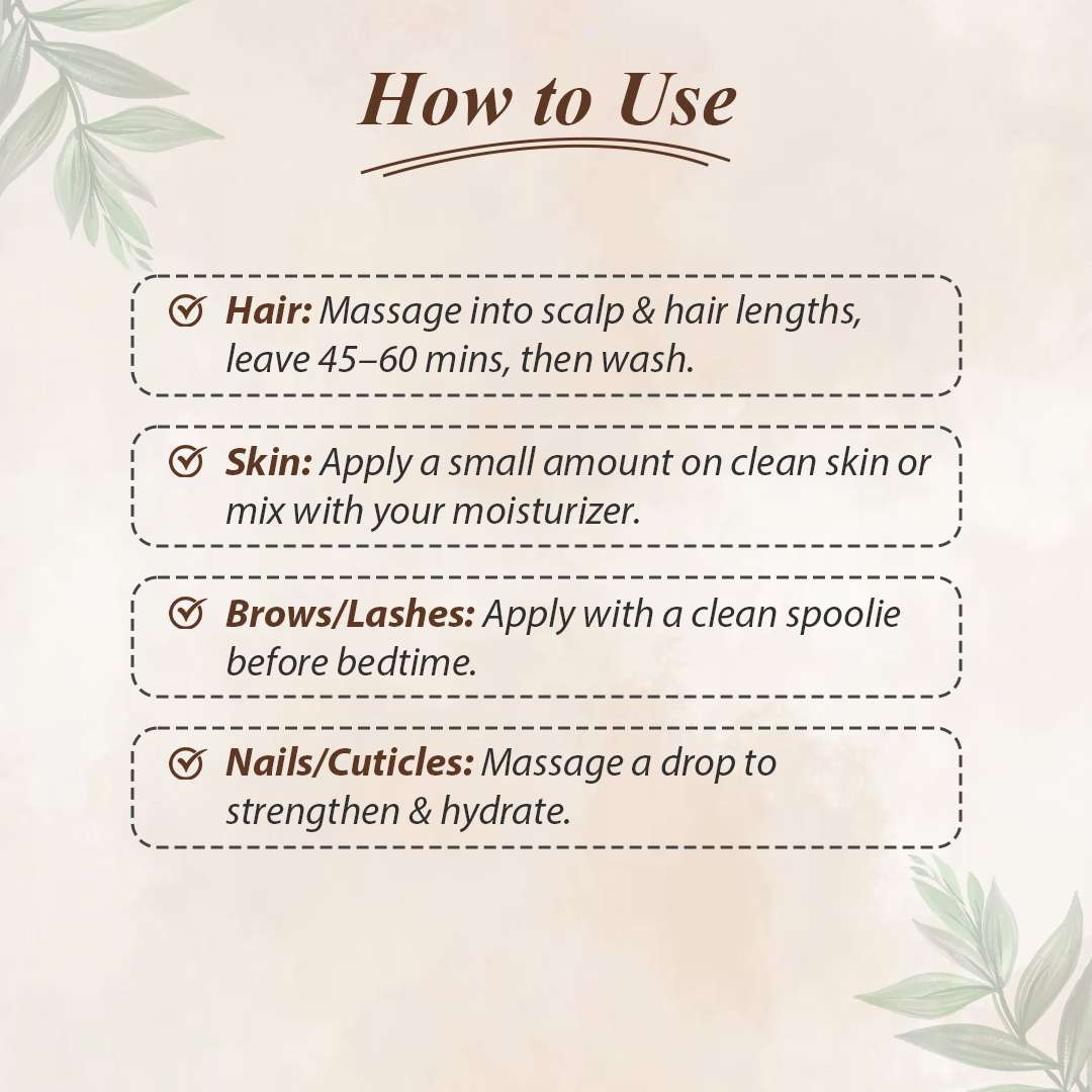 Hair Growth: Apply to scalp, roots, and lengths 1–2 times per week. Massage in, leave for 1 hour or overnight, then wash with a gentle shampoo.