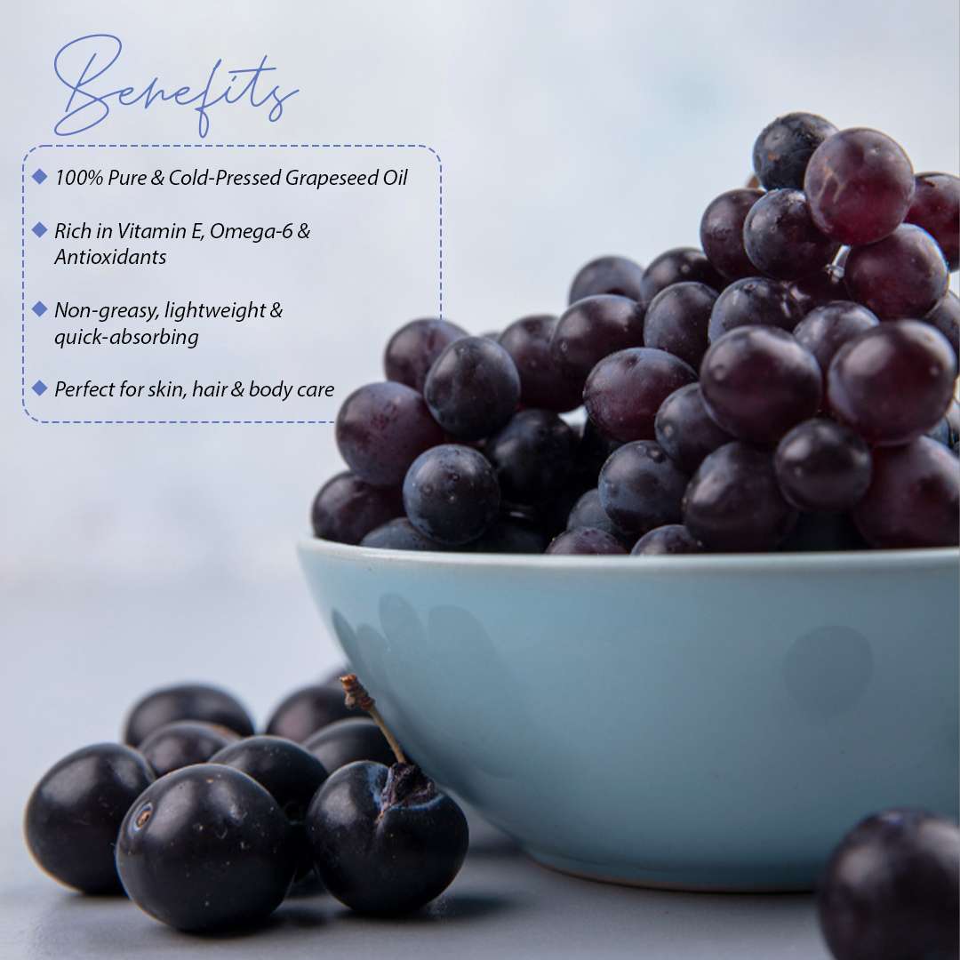 Grapeseed oil deeply moisturizes and repairs the skin barrier, leaving skin softer, less flaky, and more resilient to pollution and sun damage. It tightens pores, fades acne scars and dark spots, and helps balance sebum, making it perfect for oily, combination, and acne-prone skin.