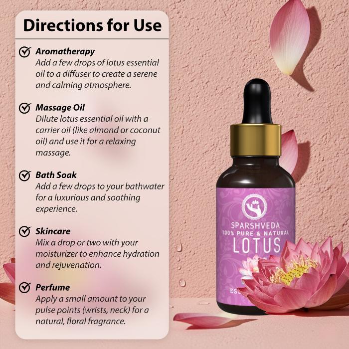 Sparshveda Lotus Essential Oil is known not only for its aroma but also for its versatility. When diffused, it fills spaces with a serene energy that helps lighten the mood and refresh the senses.