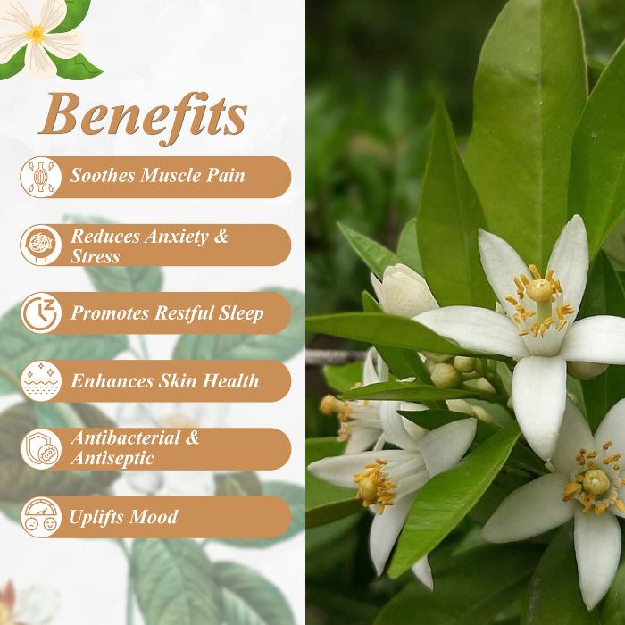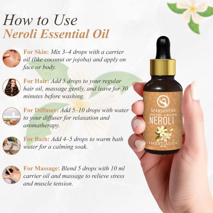 Combine 5–8 drops of neroli essential oil with 1 tablespoon (15 ml) of carrier oil such as sweet almond or grapeseed. Use as a slow, mindful massage oil for neck, shoulders, back or legs, especially in the evening.