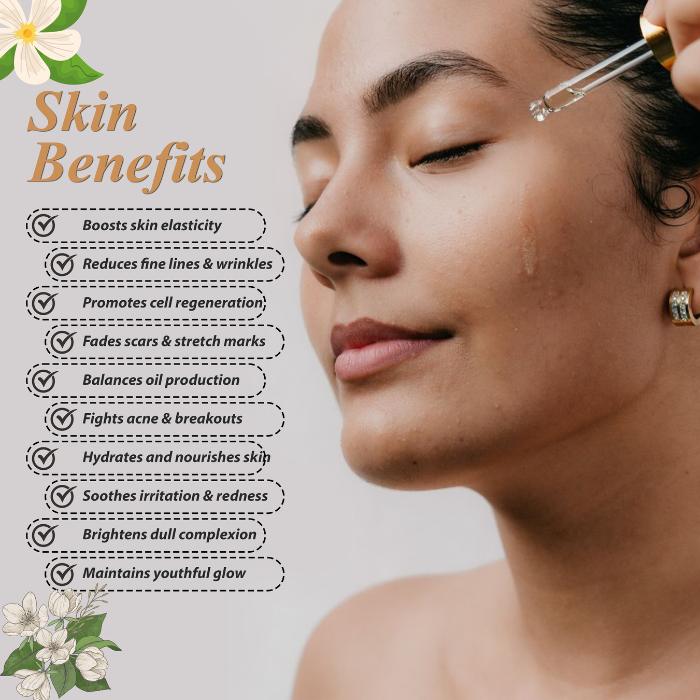 On the skin, neroli is a favourite in high‑performance facial oils and serums targeted at dull, tired, sensitive or mature skin. When diluted correctly in carriers like jojoba, argan, rosehip or sweet almond, it helps support skin elasticity, even out the look of tone, and soften the appearance of fine lines, scars and stretch marks over time.