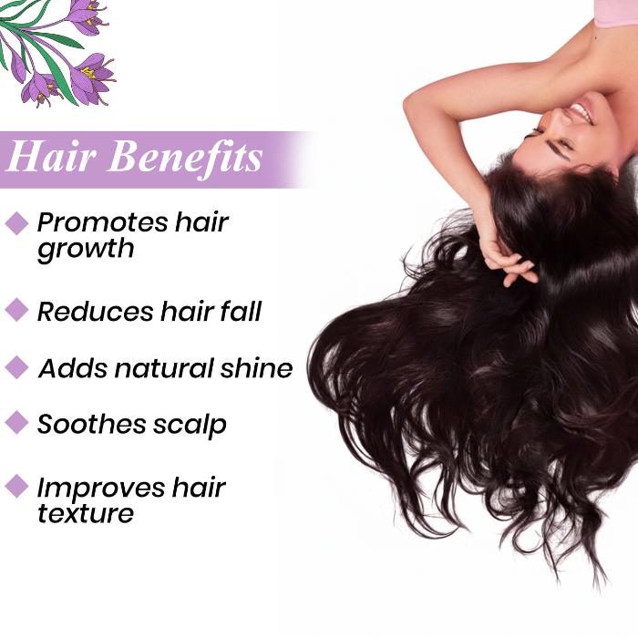 Saffron oil stimulates blood circulation to the scalp, strengthening hair follicles and promoting healthier, shinier hair growth. It also helps combat hair thinning and nourishes dry, damaged strands.