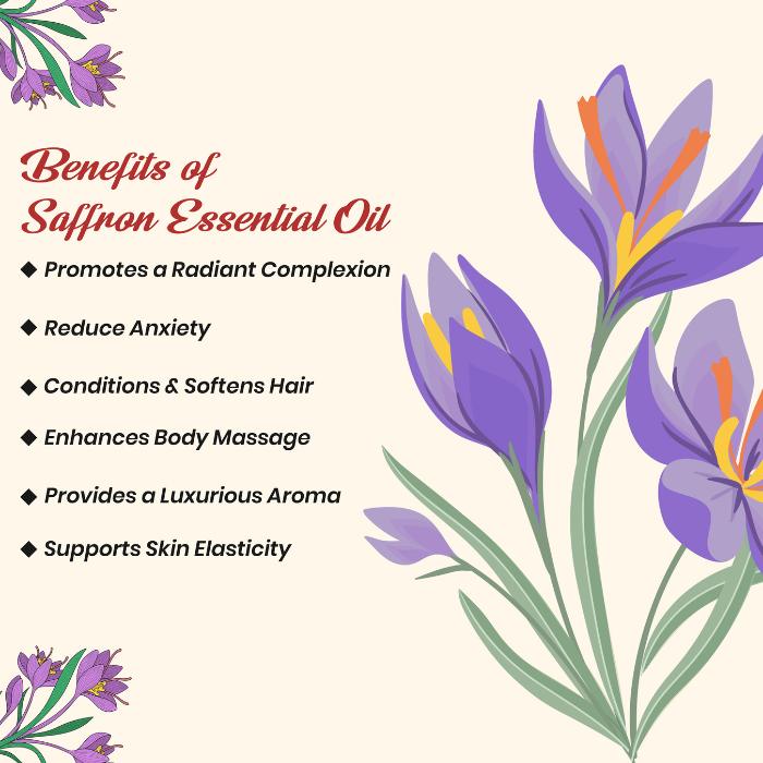 For Glowing Skin (Night Serum): Mix 1–2 drops of Saffron Essential Oil with 1 tablespoon of almond or kumkumadi oil. Massage gently onto face and neck before bed for a radiant morning glow.