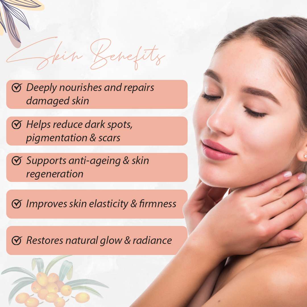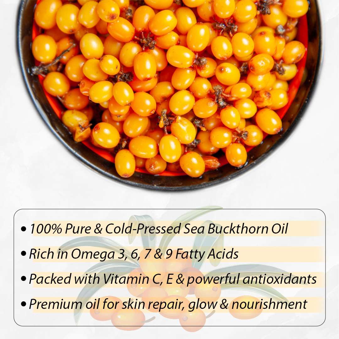 Mix 2–3 drops of sea buckthorn oil with your carrier oil or moisturizer (like jojoba, rosehip, or squalane) and apply to slightly damp skin at night to boost hydration, glow and barrier repair.