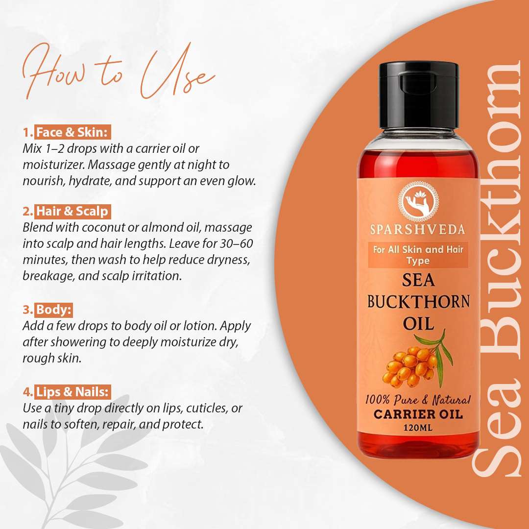 For hair and scalp, Sparshveda Sea Buckthorn Oil nourishes follicles, supports the hair shaft structure, and helps improve softness and shine while protecting against breakage and dryness.