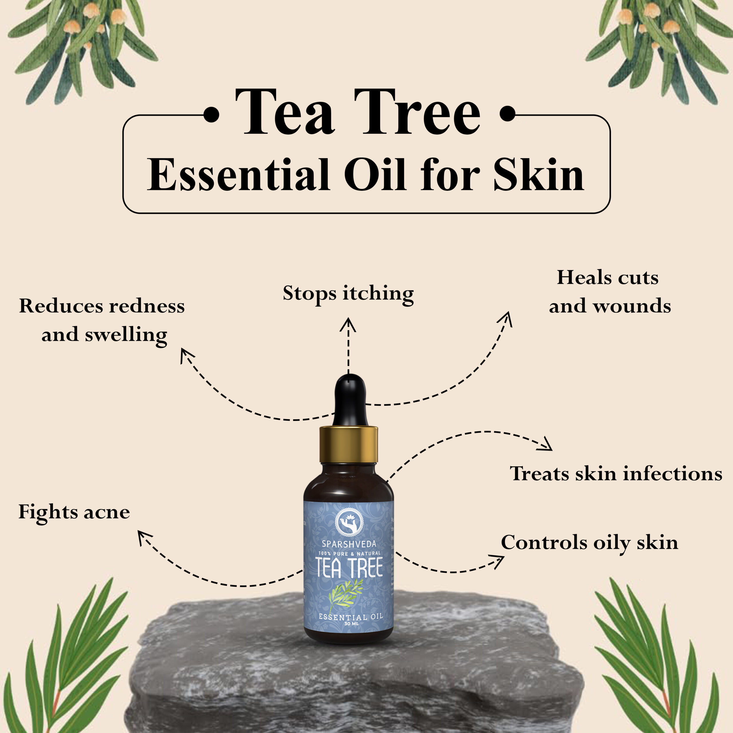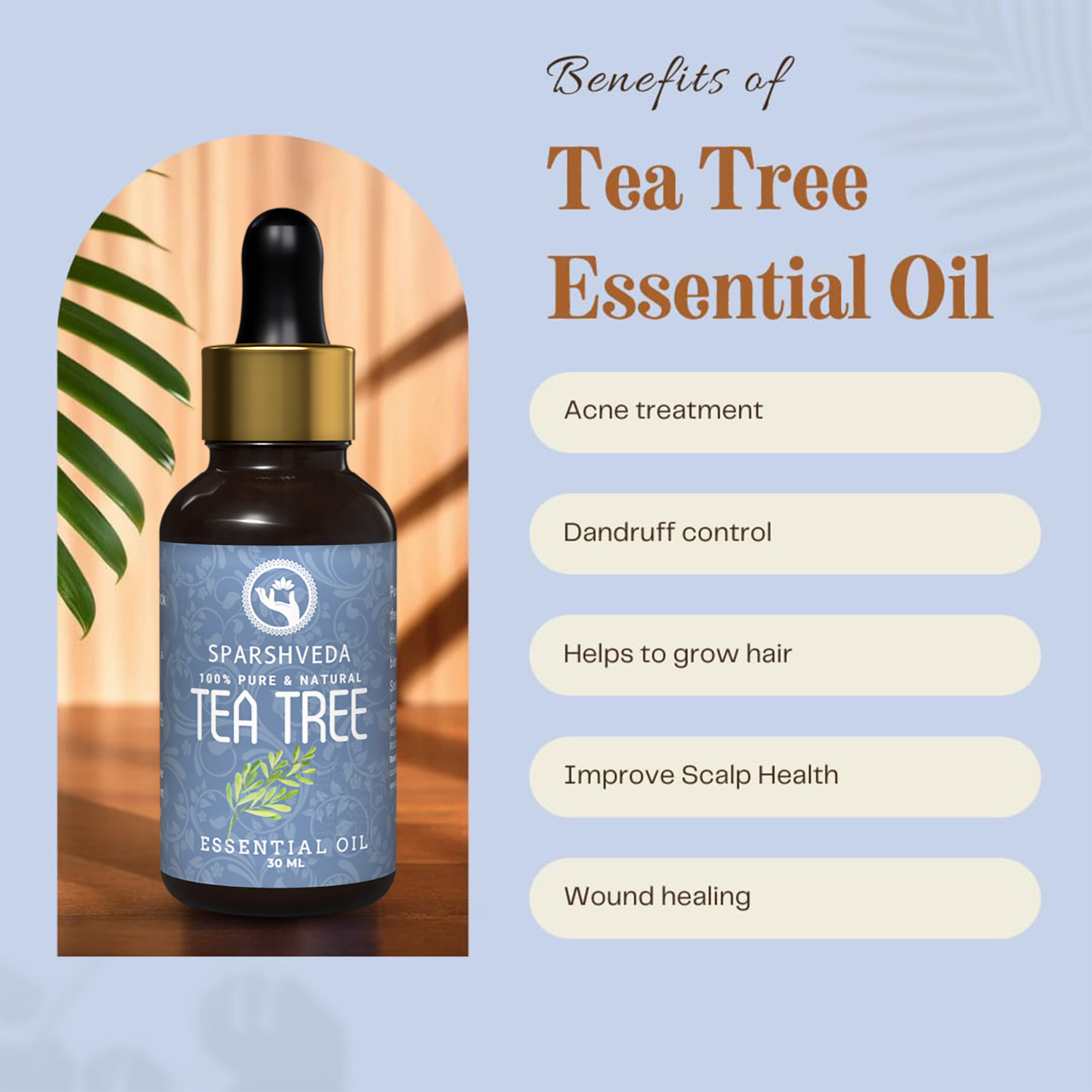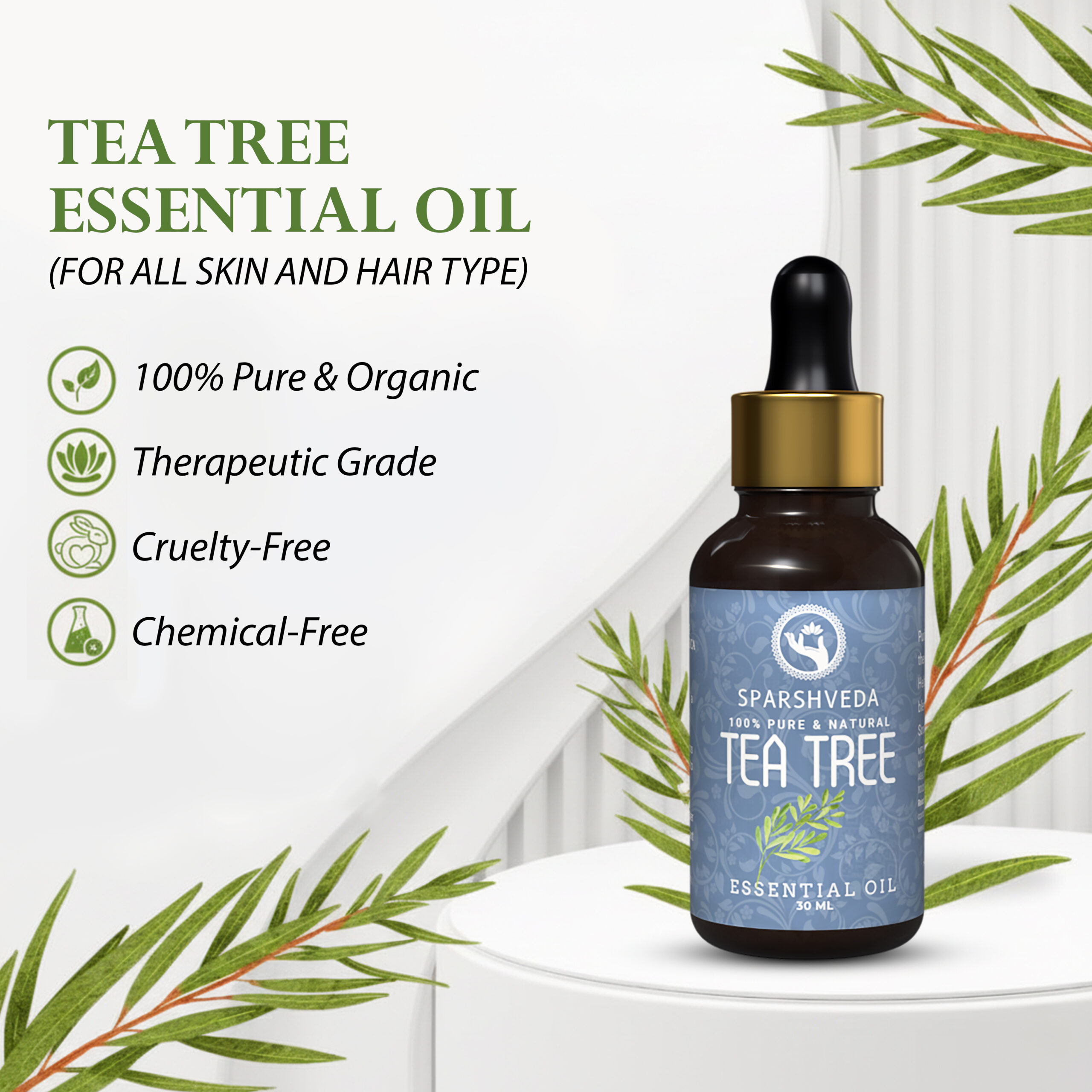 Sparshveda Tea Tree Essential Oil is a 100% pure, natural extract of Melaleuca alternifolia renowned for clarifying skin, supporting scalp health, and purifying the home environment through safe, targeted aromatherapy and topical blends when properly diluted.