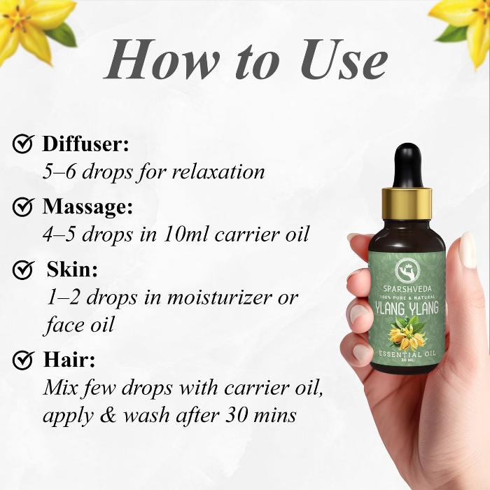 Hair Growth & Scalp Health: A traditional beauty secret from the Victorian era (famously used in Macassar oil), Ylang Ylang Essential Oil stimulates hair follicles and improves blood circulation to the scalp, promoting thicker, faster hair growth and reducing hair fall.